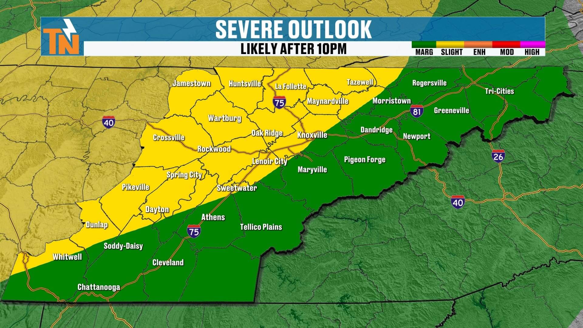 The Storm Prediction Center has placed our area under a Level 1 to Level 2 risk for strong to severe storms late tonight — mainly after 10 PM through the early overnight hours.