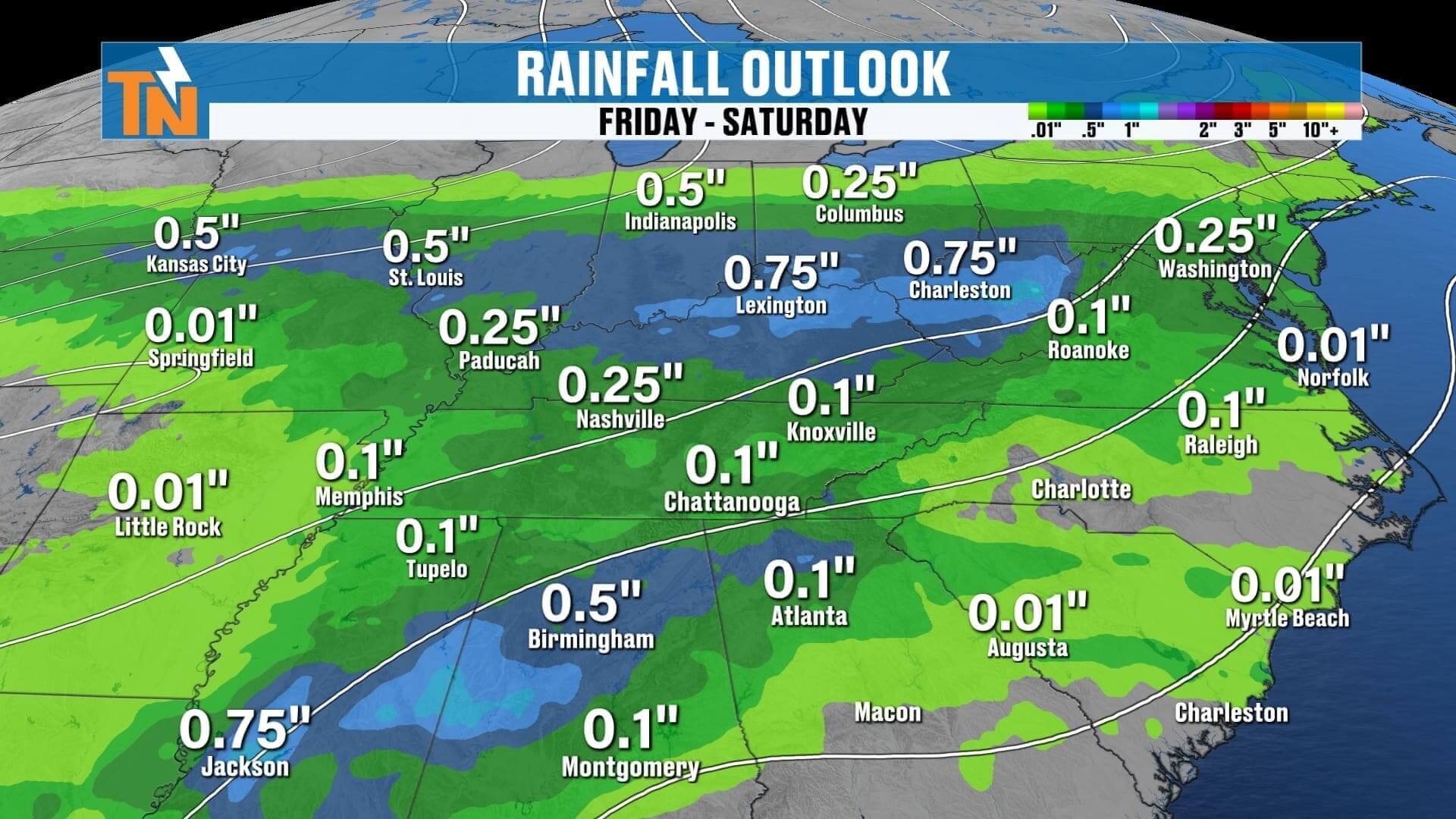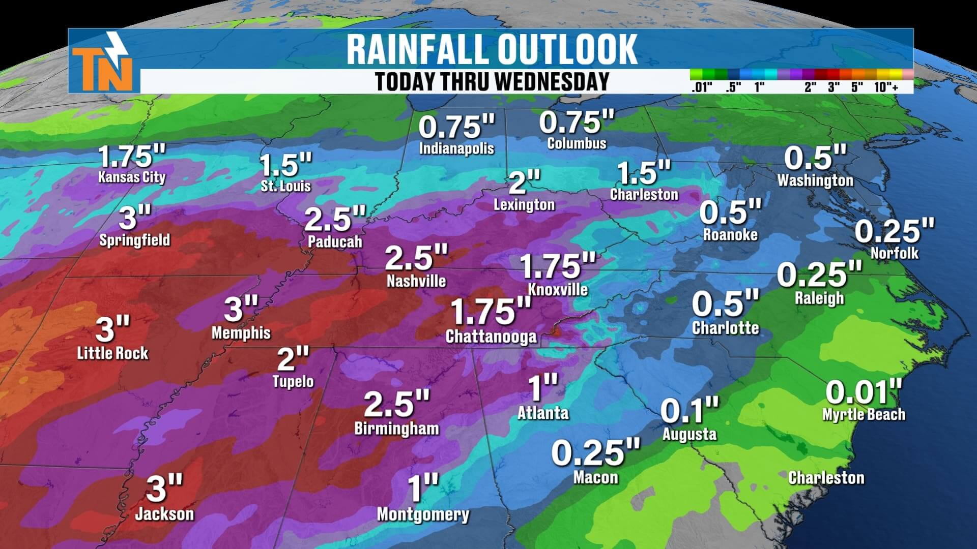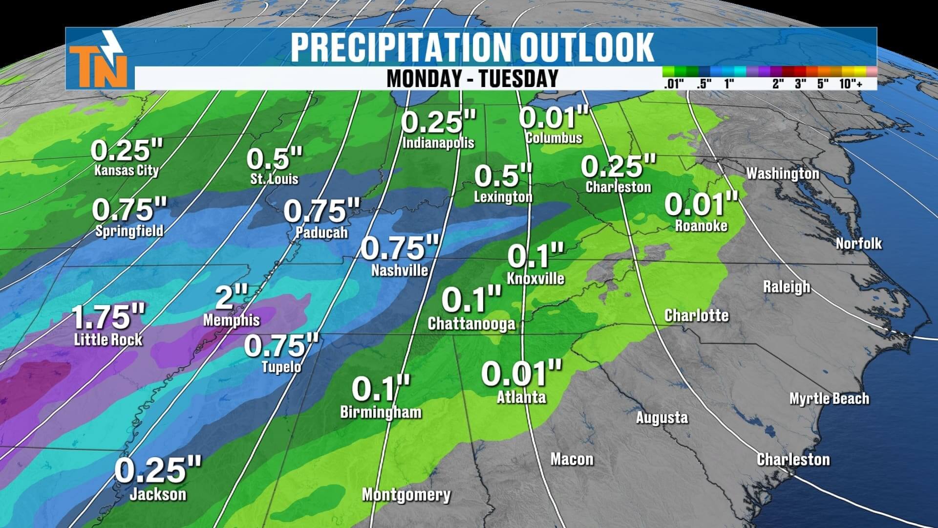 • East Tennessee sees 0.25″ to 0.75″ through Wednesday