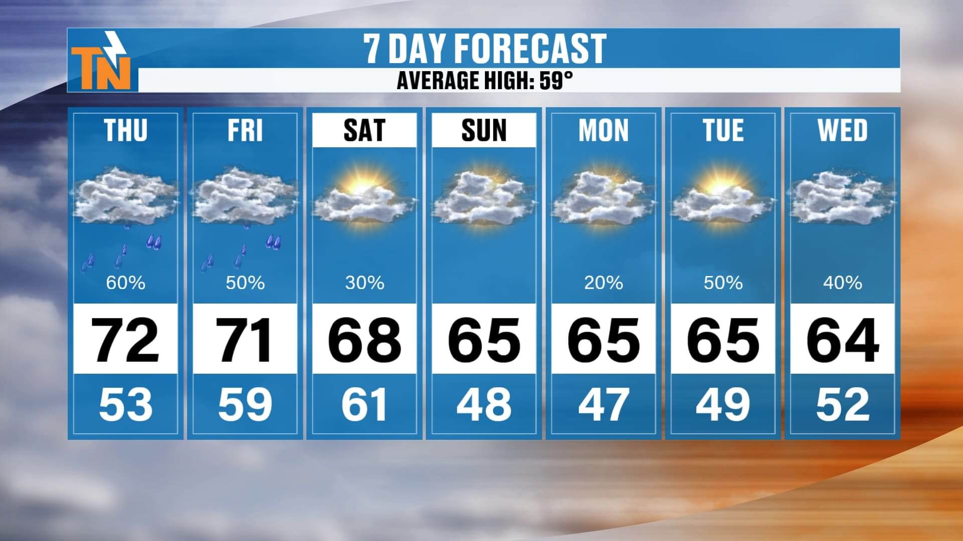 Thursday: Low 70s, clouds increasing, rain late