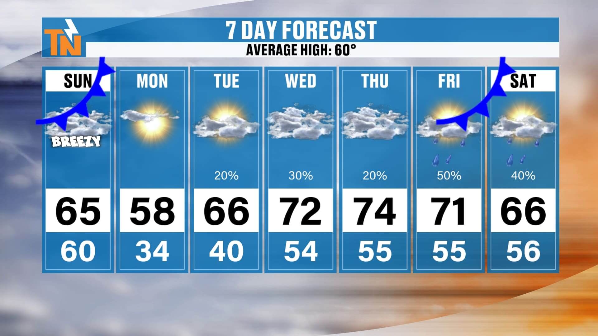 Temperature-wise, today stays mild at 68. Monday cools down behind the front with a high near 58 — right on average for this time of year. That quick cool spell only lasts a day or so. After that, we bounce right back into a warm stretch with highs returning to the mid to upper 60s and low 70s through midweek and beyond.