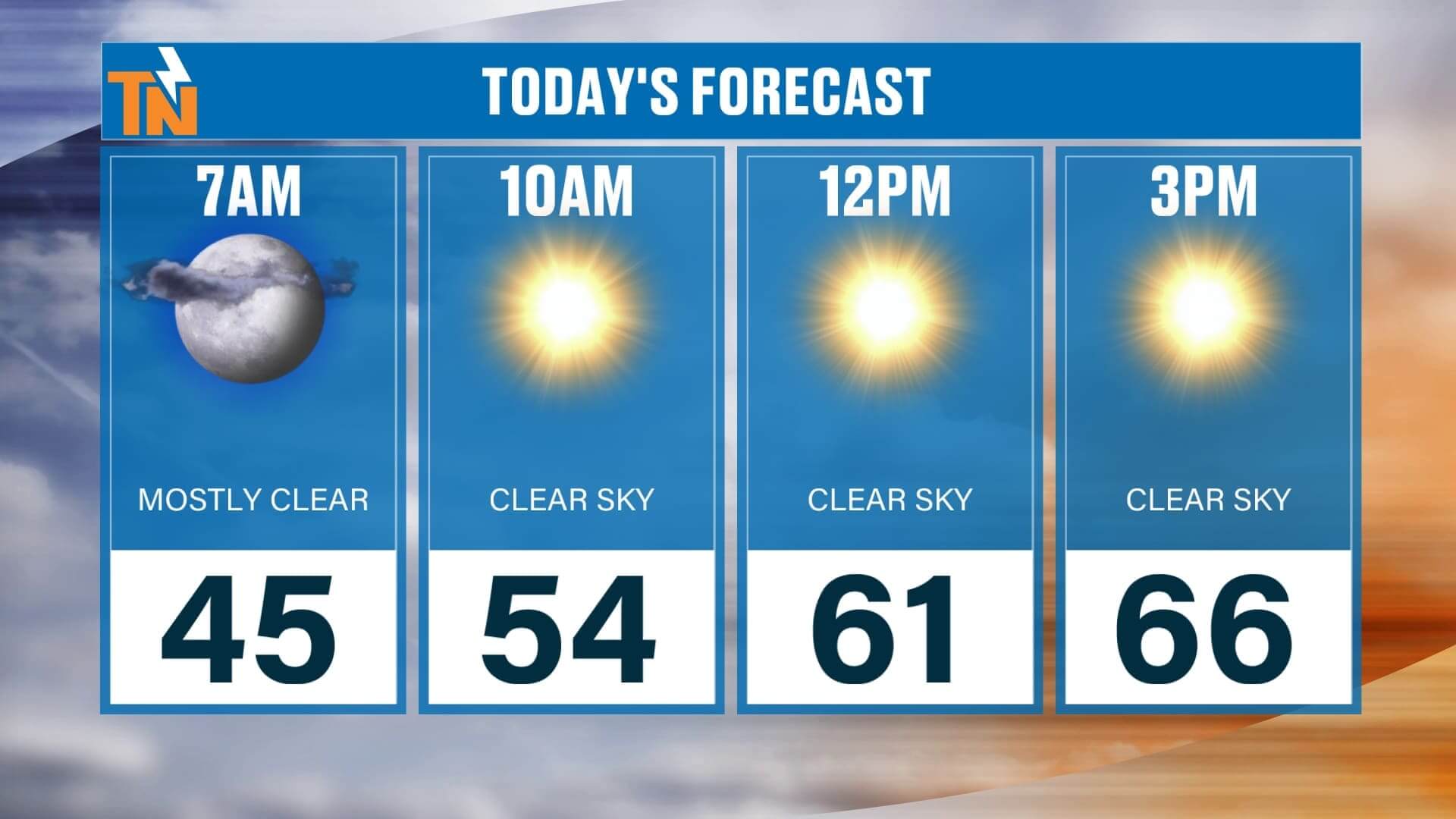 We start the morning in the 40s, warming nicely through the afternoon with highs in the mid to upper 60s — right on track for early November. It’ll be a gorgeous, crisp fall day with light winds and a clear sky. This evening, temperatures fall quickly after sunset — 58° around dinner time, 53° by bedtime — so you’ll definitely want a jacket if you’re out late.