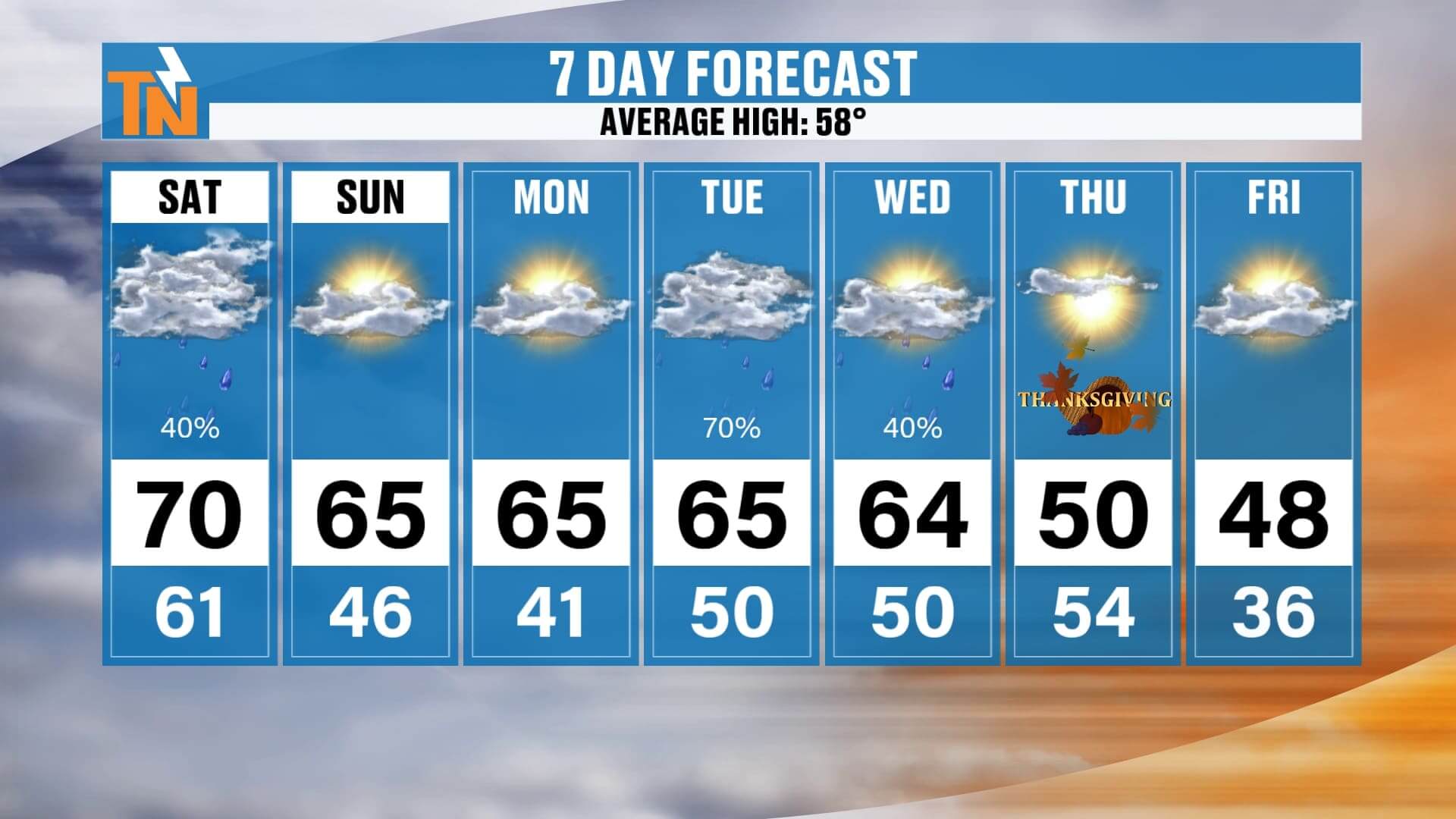 Sunday: 65°, cooler but pleasant