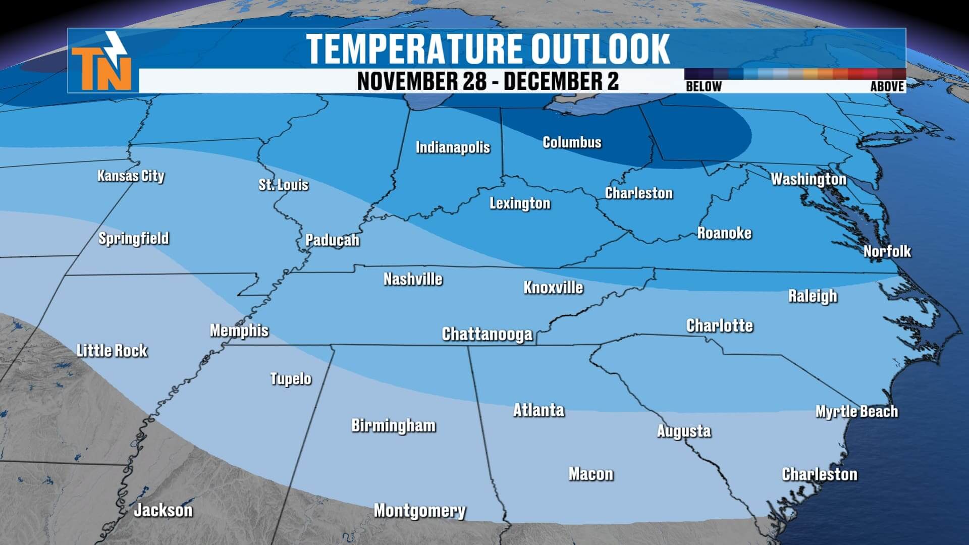• A few pockets of 50s toward the Tennessee River and southern valley