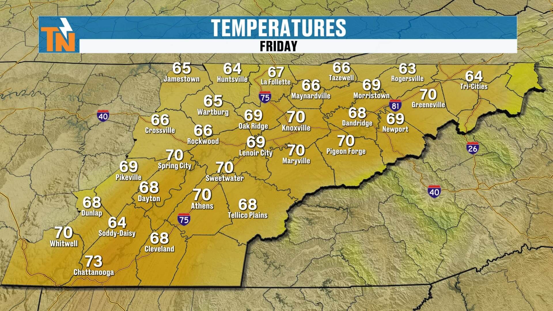 High school football fans: Kickoff temperatures will be near 85° at 6 PM, sliding down to a comfortable 76° by 10 PM. While most games should be fine, keep an eye on our interactive radar in the eastTNweather app for any pop-up storms.