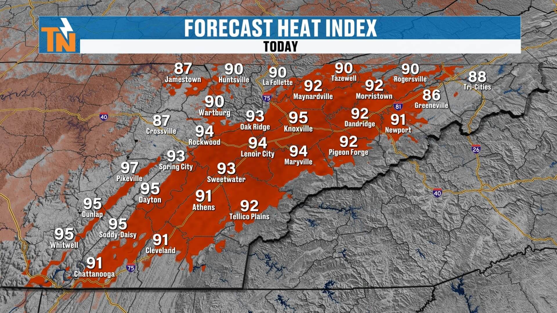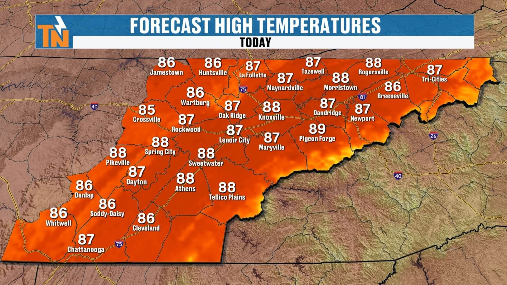 We’re kicking off the day with clear skies and morning temperatures in the 60s and 70s across the Tennessee Valley, Smokies, and Tri-Cities. It feels good outside now, but keep in mind humidity levels remain on the higher side. This afternoon will turn warm and muggy, with highs in the mid to upper 80s. When you factor in humidity, it will feel more like the low to mid-90s.