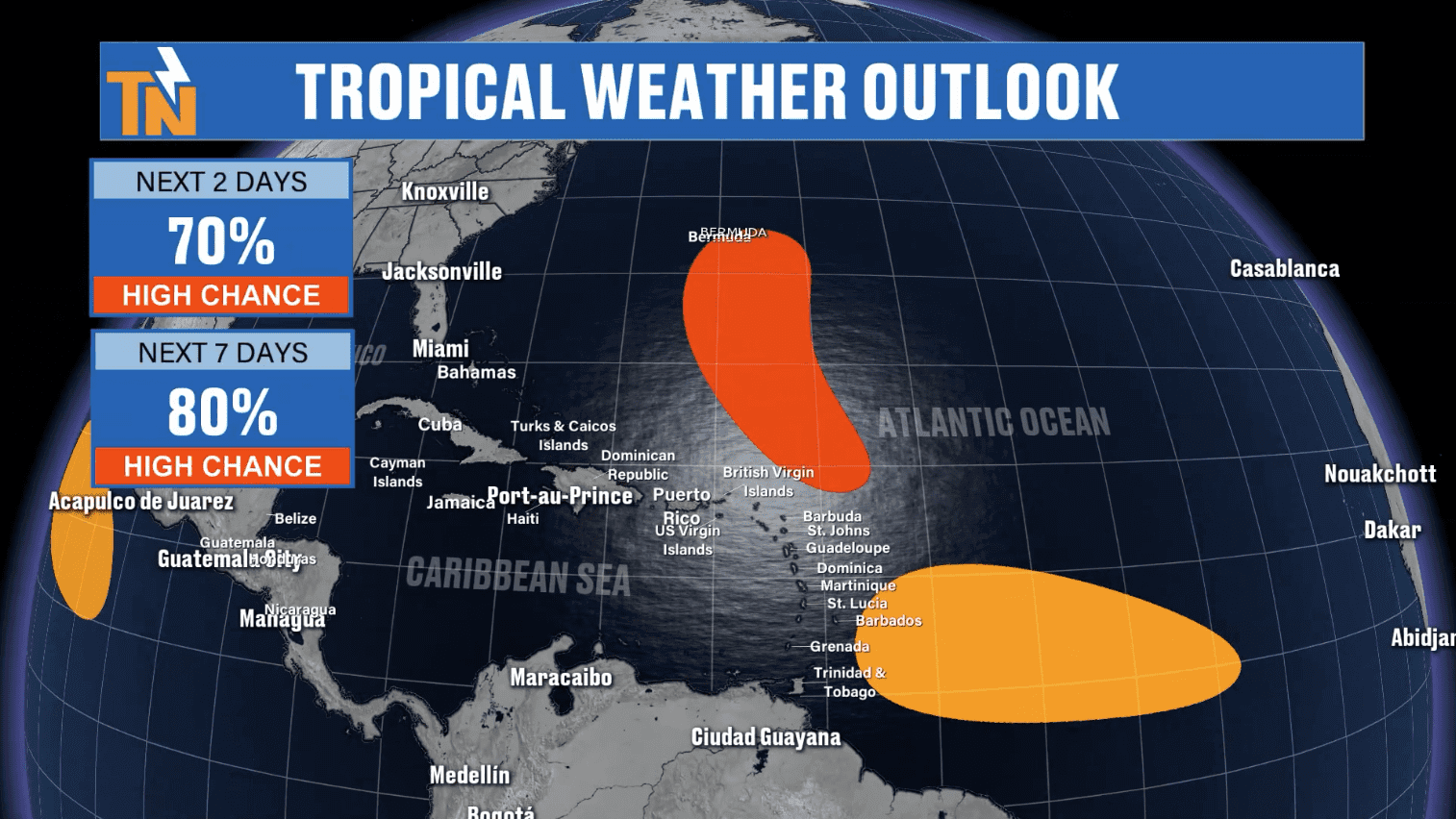 Another disturbance has a 70–80% chance of development, which could become Tropical Storm Ferdinand.