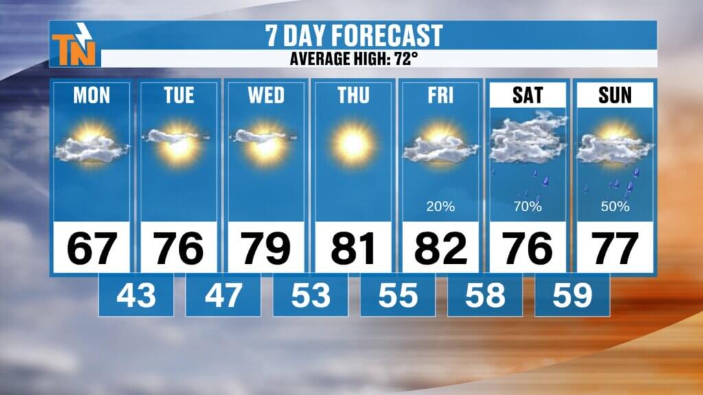 - Weekend: Mid to upper 70s with increasing rain chances