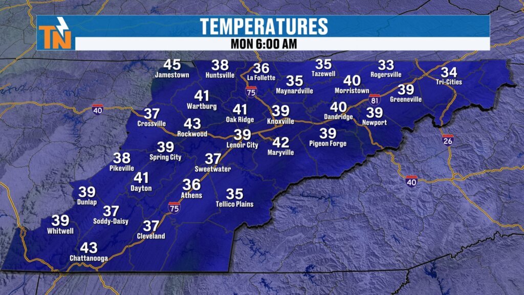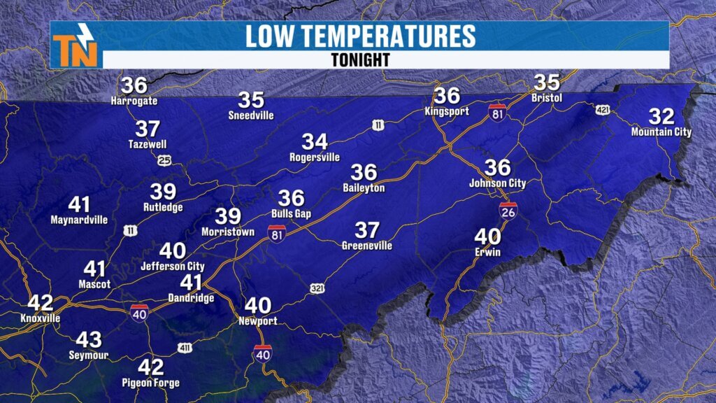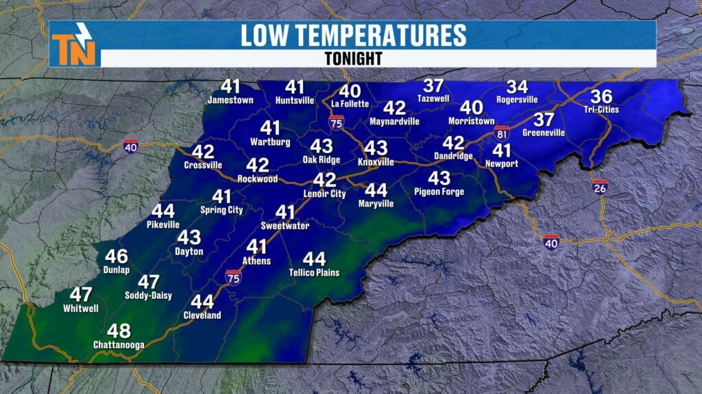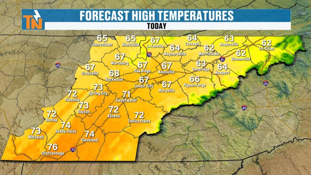 - Cooler north, warmer south (low 60s Kingsport area vs mid 70s Chattanooga)