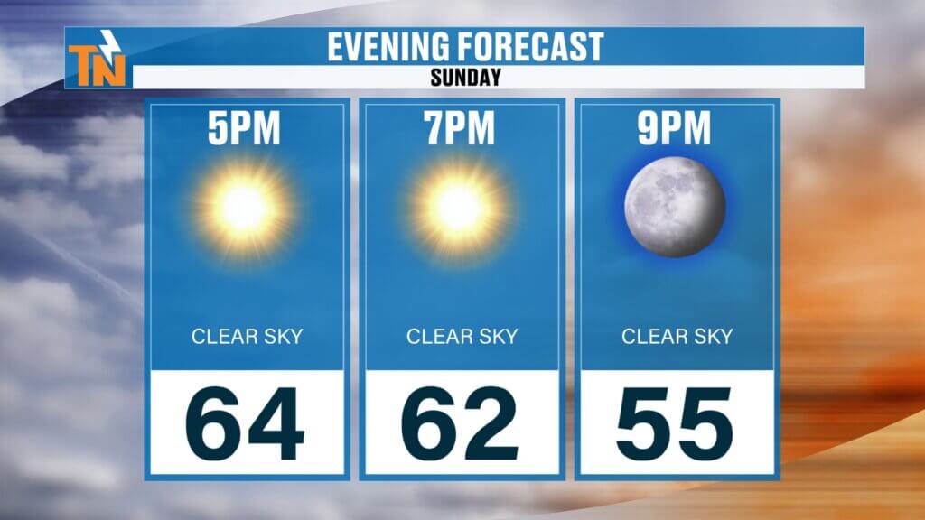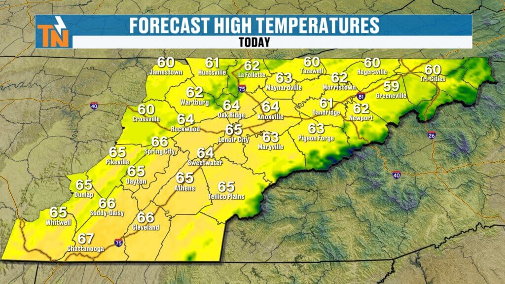 - Afternoon highs: Mid to upper 60s (about 20 degrees cooler than Saturday)