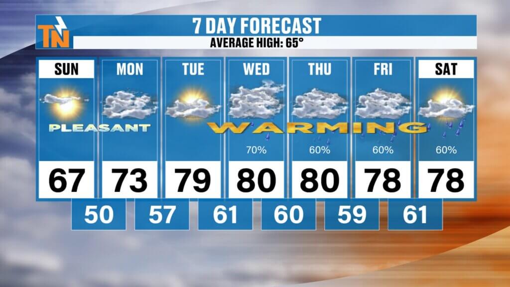 - Sunday: Warmer (low 70s)