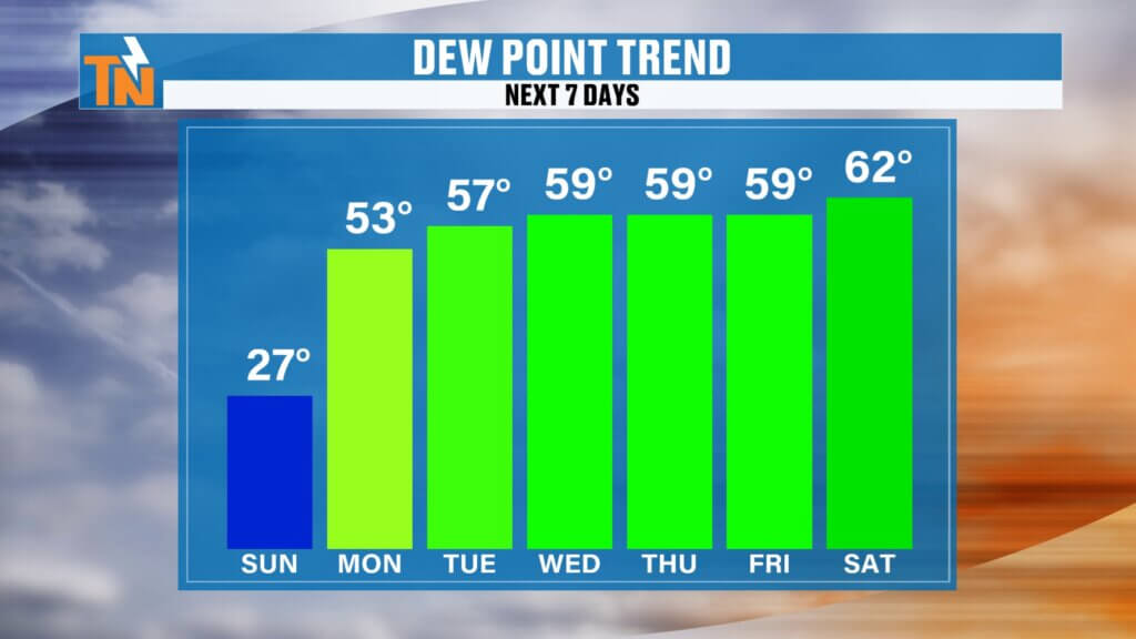 - Dew points rise steadily starting Sunday