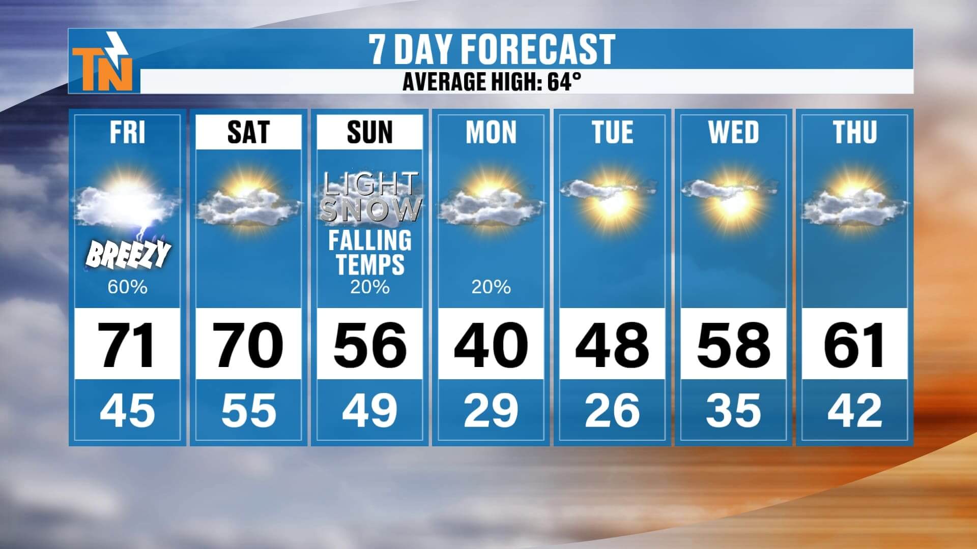 • Fri: Near 70, evening storms