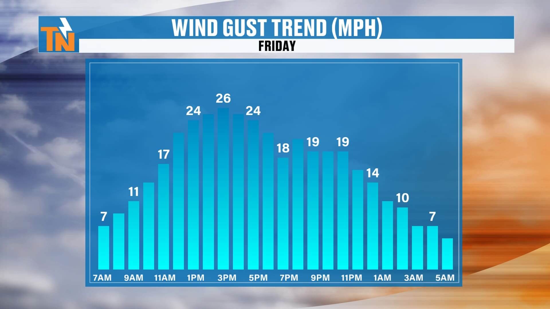 A quiet, milder start in the 30s/40s/50s. Increasing clouds and a gusty breeze (near, but generally below, advisory criteria). Highs in the 60s to near 70.