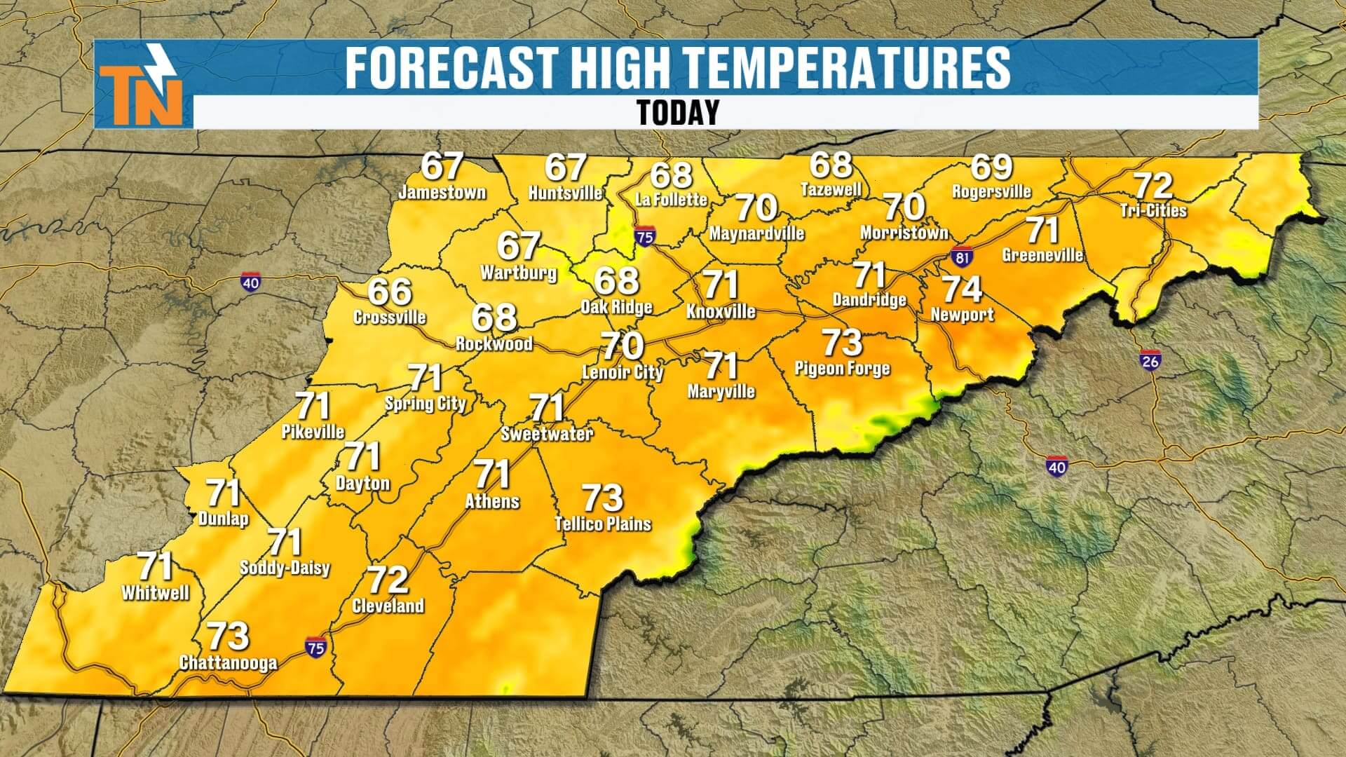 SPC keeps a Level 1 (Marginal) risk mainly along the Cumberland Plateau. Damaging wind is the primary threat; pea-size hail is possible with colder air aloft.