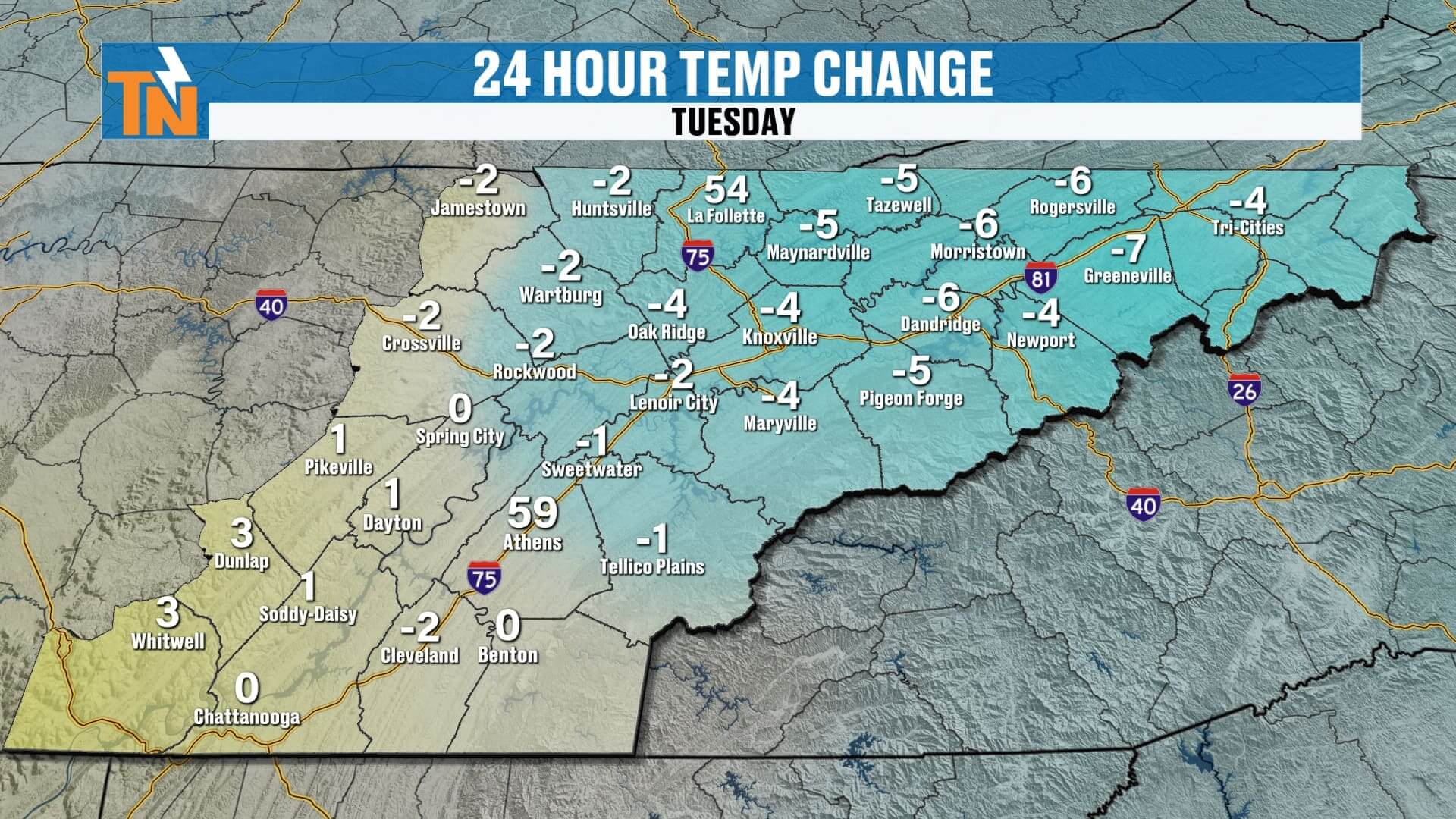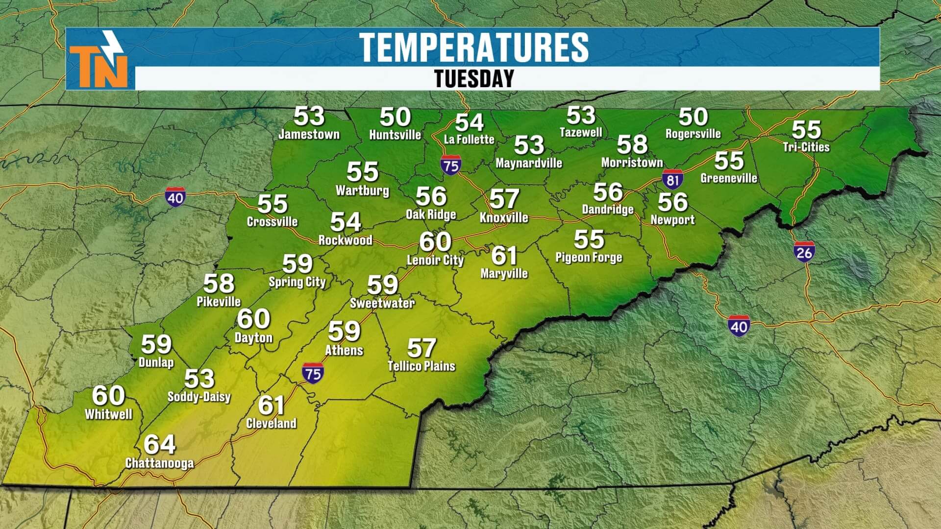 Wednesday Morning: Could be the coolest start of the week, with many Valley towns dipping into the low 50s and some 40s again for the Plateau and Smokies.