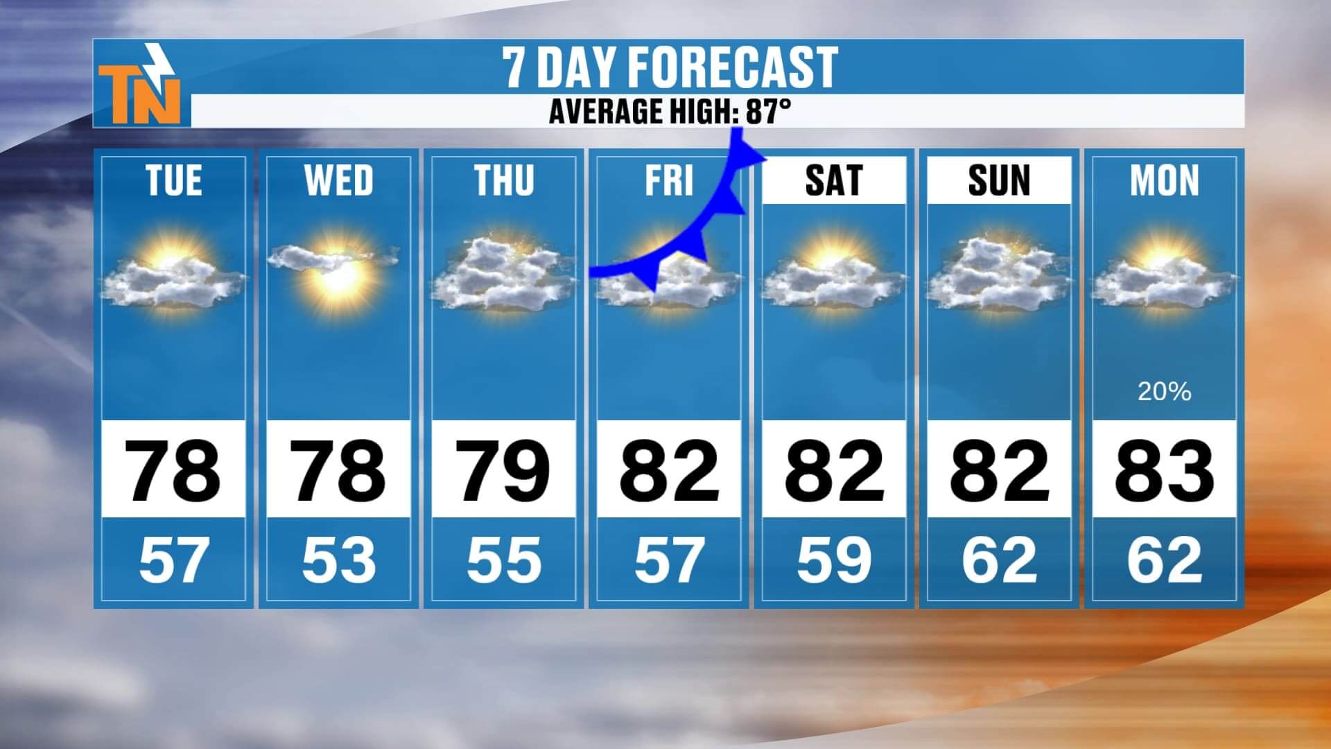 Wednesday–Thursday Afternoons: Highs remain in the upper 70s to near 80°, with low humidity making it feel even better.