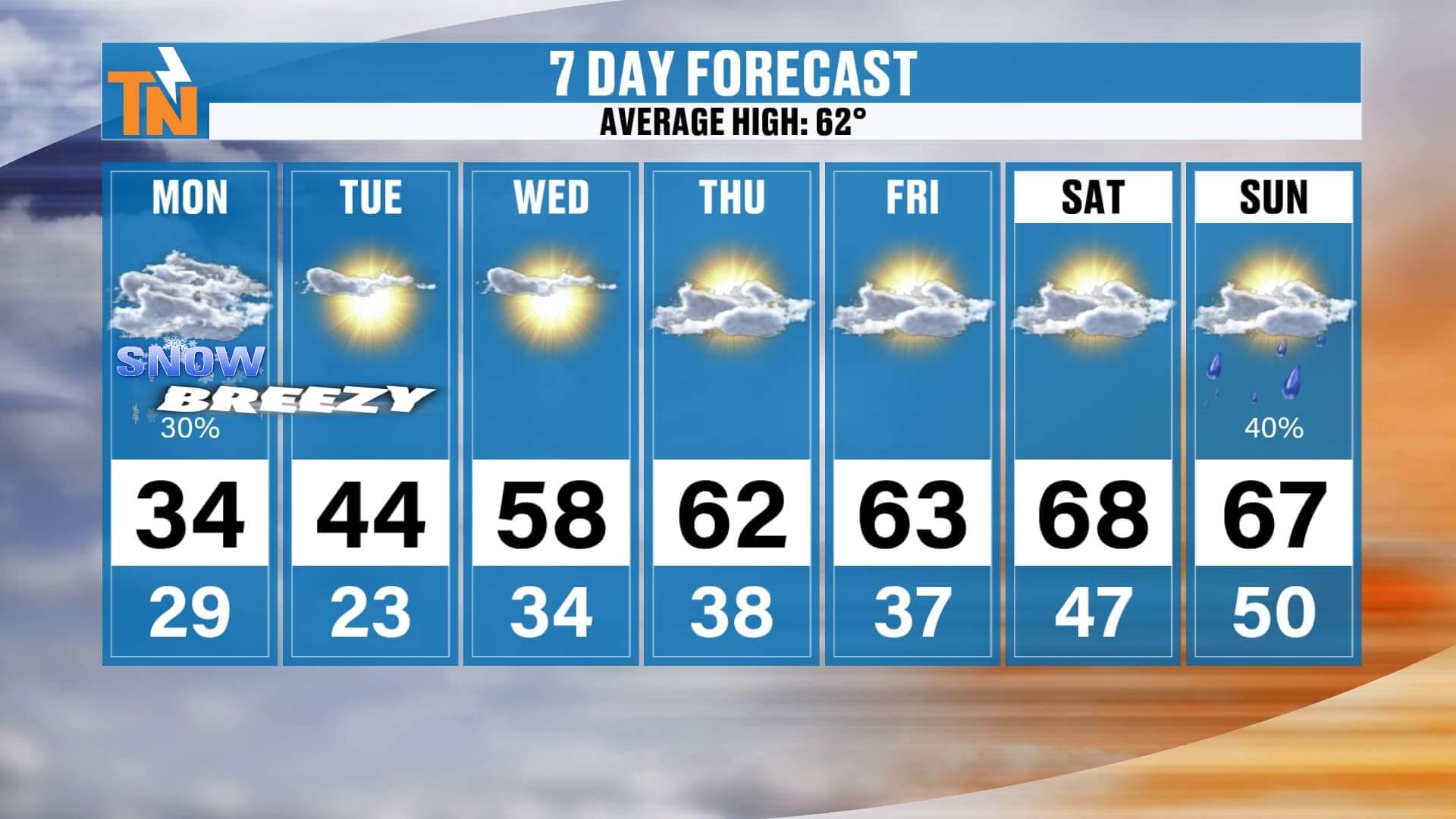 • Tuesday: 44°, still breezy and cold.