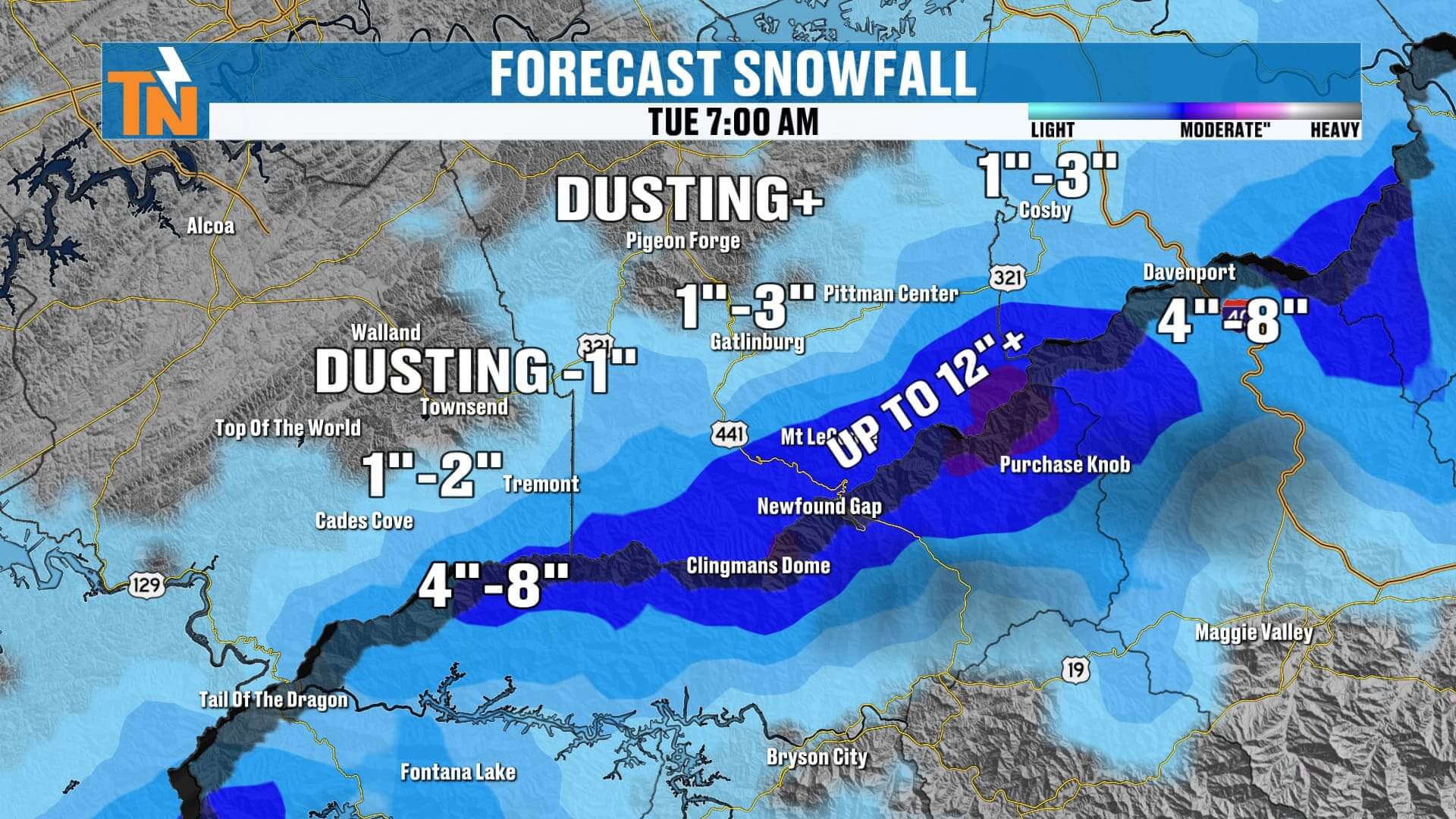 • Smokies (highest peaks): 4–8″, with localized 10–12″ totals on Mt. LeConte, Clingmans Dome, and Newfound Gap