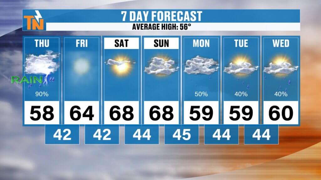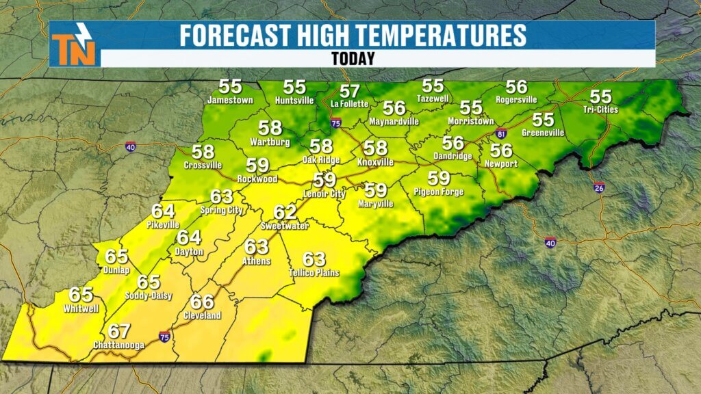 Cloud cover overnight kept temperatures mild this morning, with readings in the 40s and 50s. We’ll warm back into the 50s area-wide today, with some communities south of Knoxville reaching the low 60s.