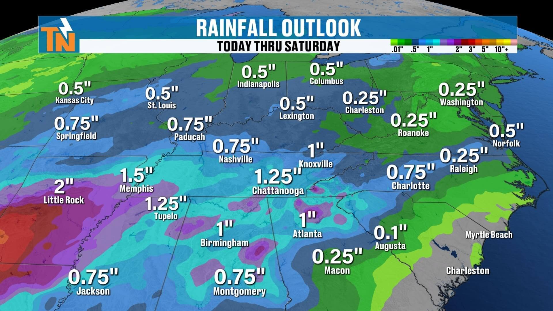 • Overnight — rain begins west of I-65 (Middle TN, northern Alabama, western KY)