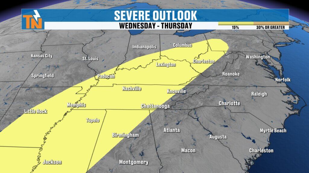 The next significant weather maker arrives Wednesday into Thursday as a deep upper-level trough moves toward the Tennessee Valley.