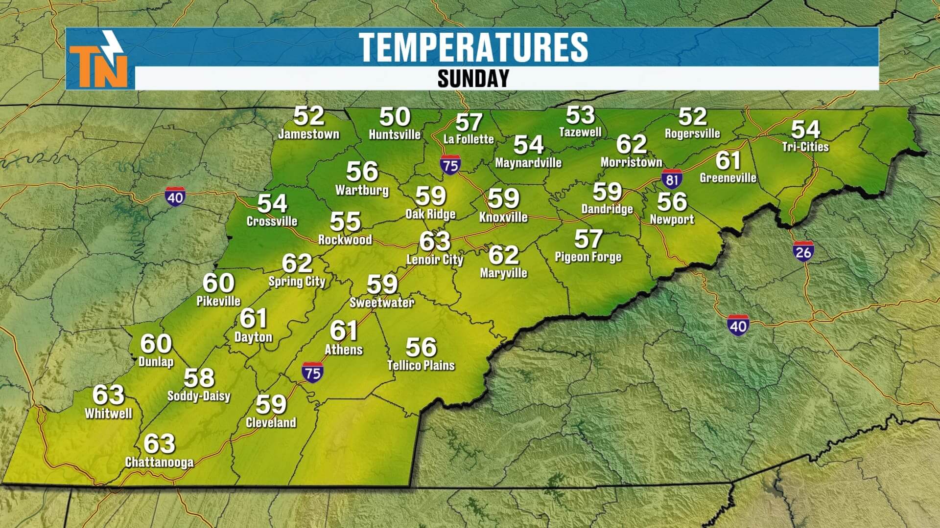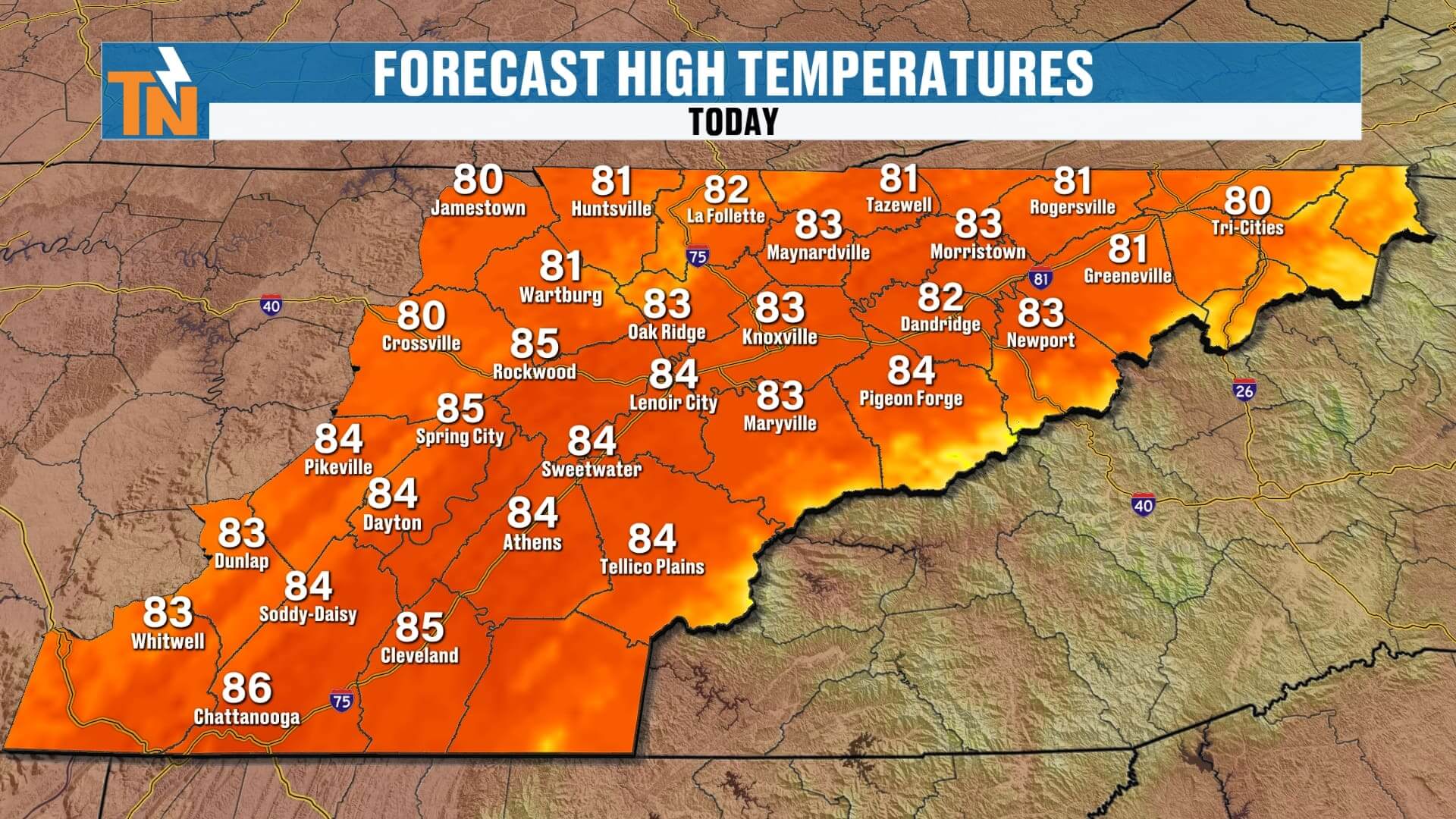 Highs: Low 80s again for most of East Tennessee.