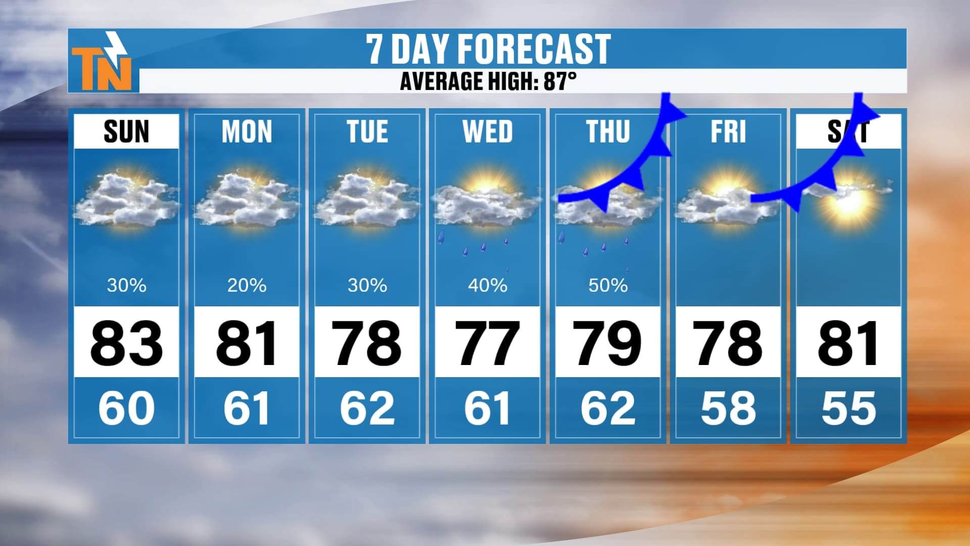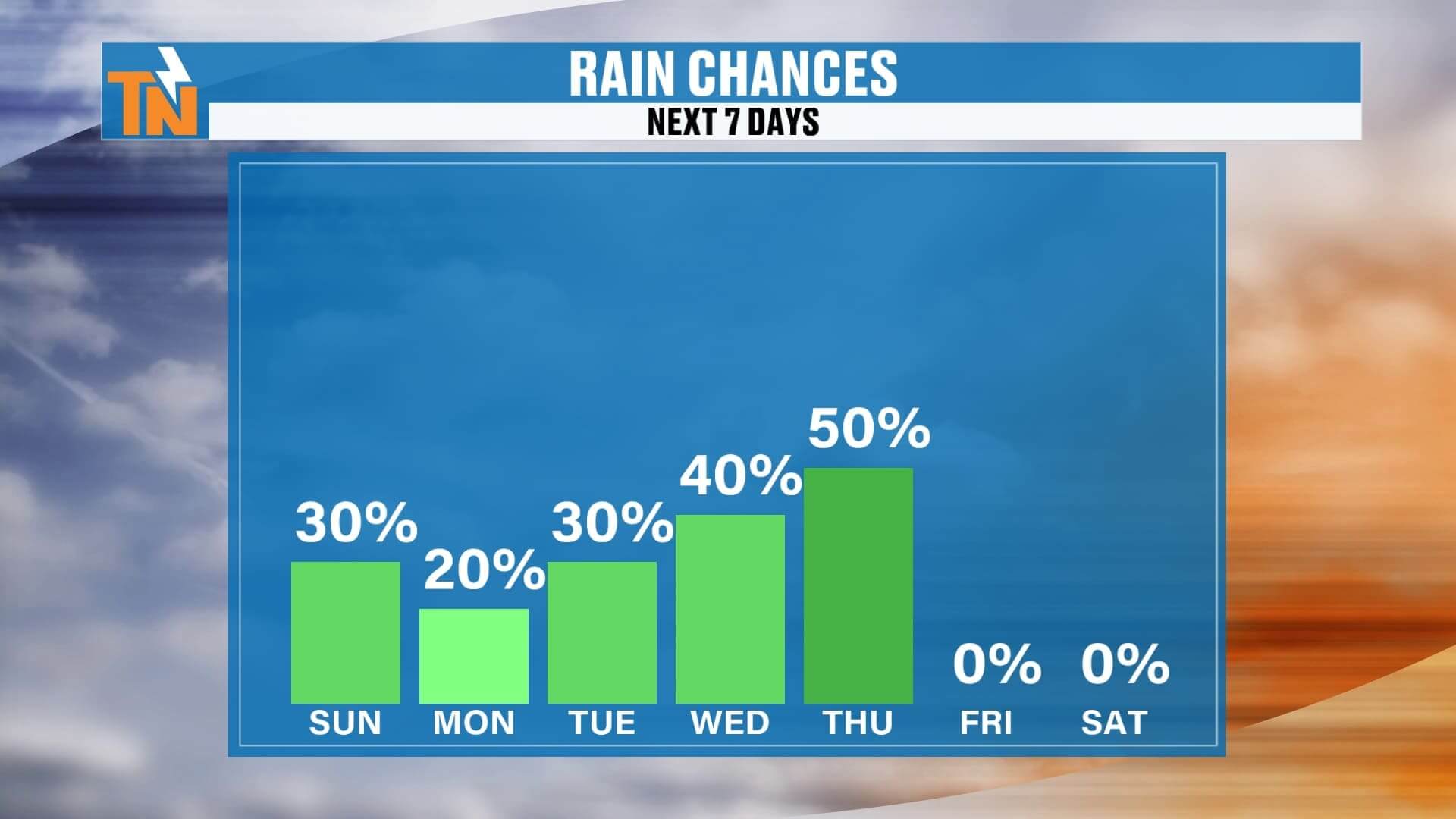 Tuesday–Thursday: Daily 30–40% rain chances return with scattered showers and thunderstorms. Humidity stays elevated, mornings in the mid-60s, highs upper 70s to low 80s.