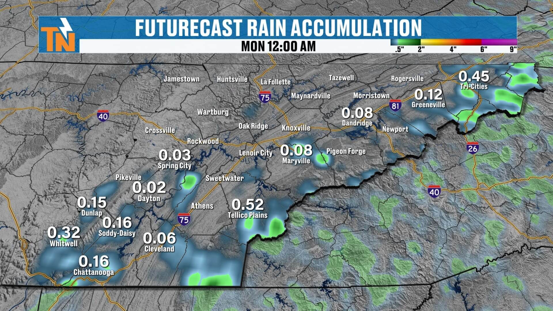 Again, the Plateau and southern counties (Monroe, Polk, Bradley) are favored for the highest rainfall.