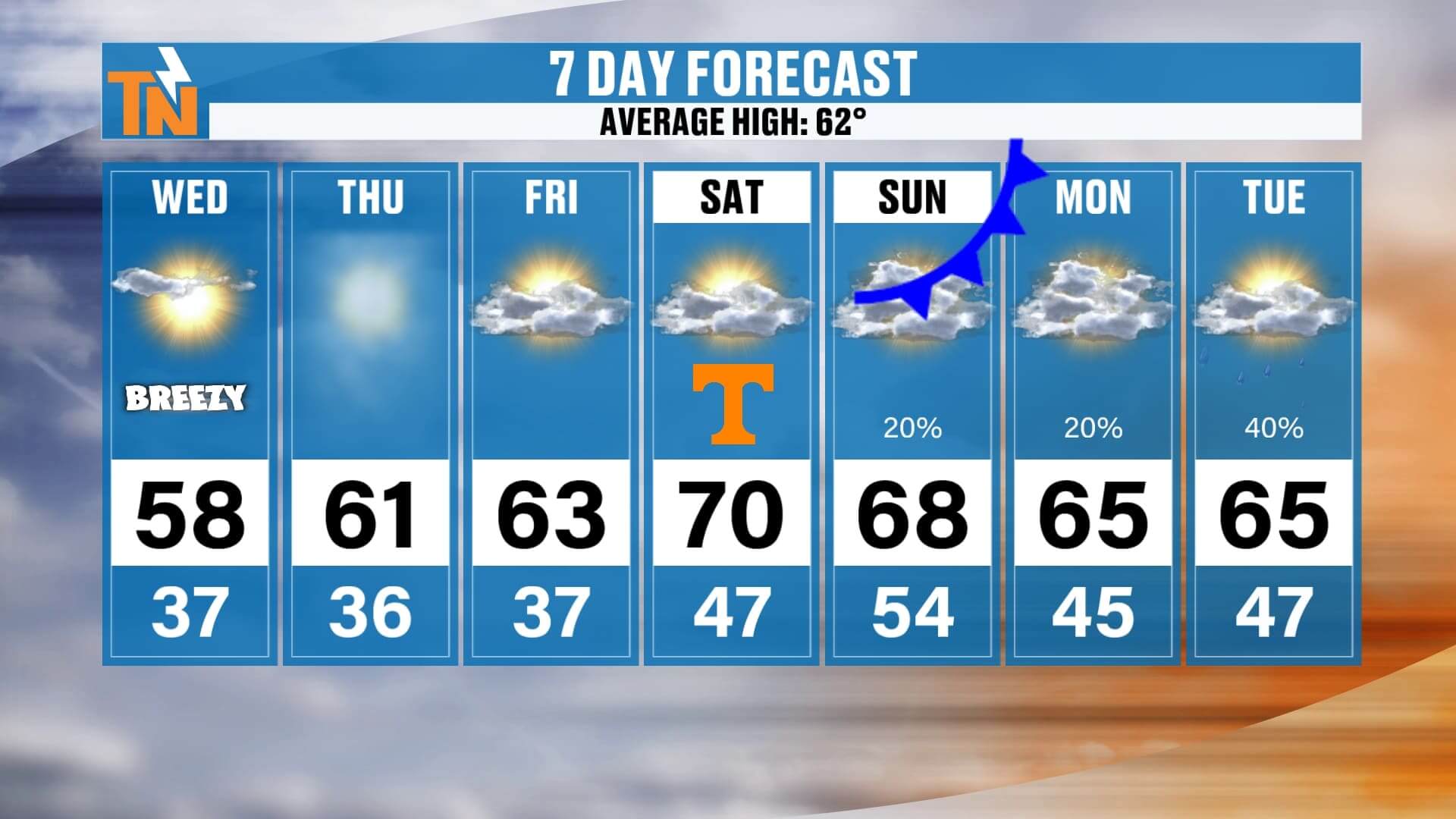 On Saturday, the wind will start to increase, especially during the afternoon. If you’re planning to head out to Neyland Stadium for the big 4:15 p.m. kickoff, you’ll definitely notice that breeze. Temperatures around lunchtime will be in the mid-60s, warming to near 70° by kickoff, and then slipping back into the low 60s once the sun goes down. It’s going to be a great day for football — comfortable, dry, and just breezy enough to feel like fall.