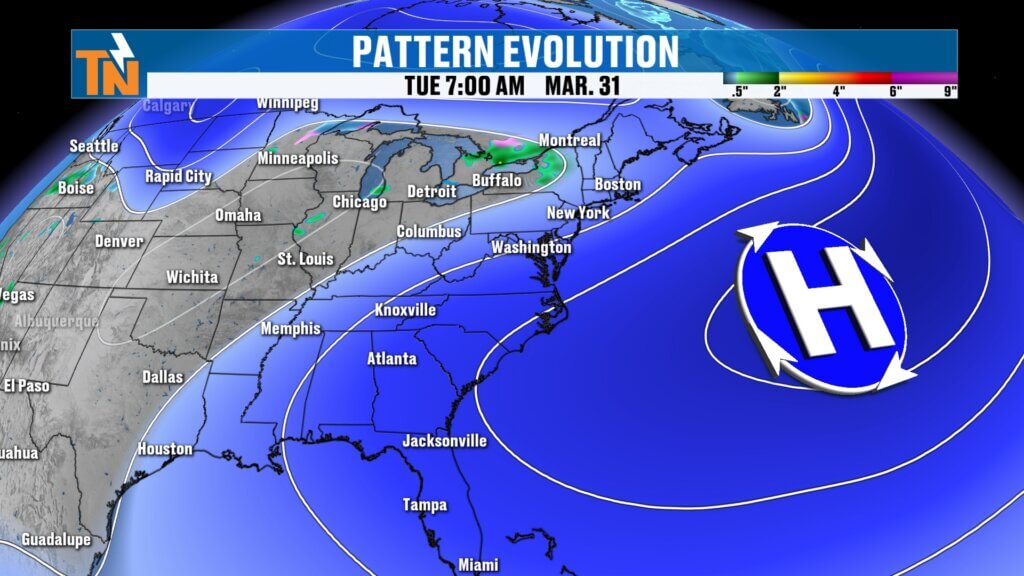 This pattern keeps temperatures above average and sets the stage for increasing rain chances later this week.