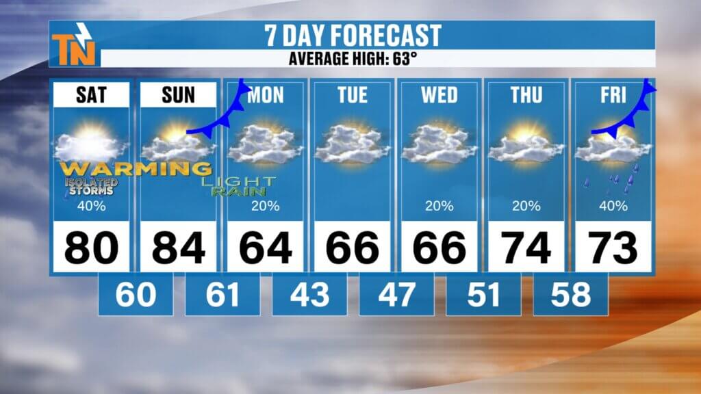 - Saturday: Warm with afternoon/evening storms, highs near 80