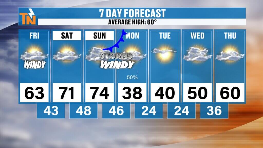 Thanks for checking in with your East Tennessee morning weather update. After a chilly start to the day, we’re looking at a beautiful but breezy Friday with temperatures warming nicely this afternoon. The upcoming weekend will bring spring-like warmth and sunshine, but a stronger storm system will move in late Sunday night into Monday bringing rain, gusty winds, and even the possibility of a few light snow showers behind the cold front.