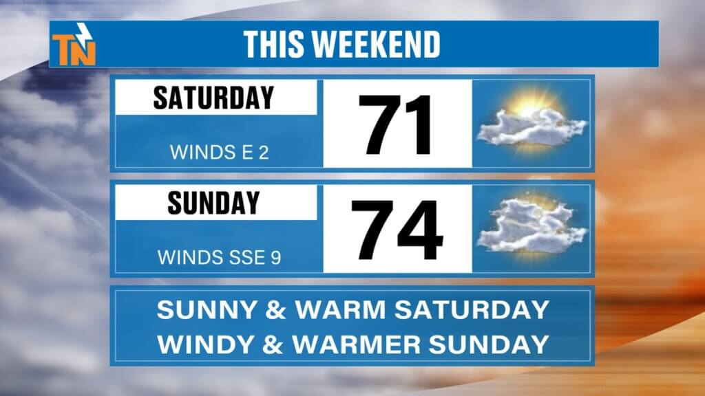 - Saturday: Sunny and warm, highs in the low to mid 70s
